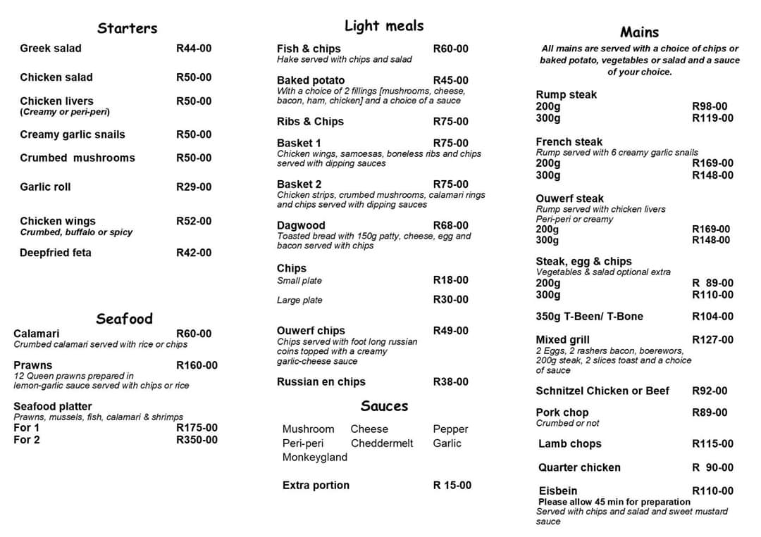 Die Ouwerf Restaurant presents a menu that feels straightforward and comforting, with a focus on hearty, familiar South African dishes. The offerings lean toward satisfying meals that suit moments when you want to relax over a good plate of food without fuss—perfect whether you're catching up with friends, enjoying a family lunch, or taking a break during a busy day.